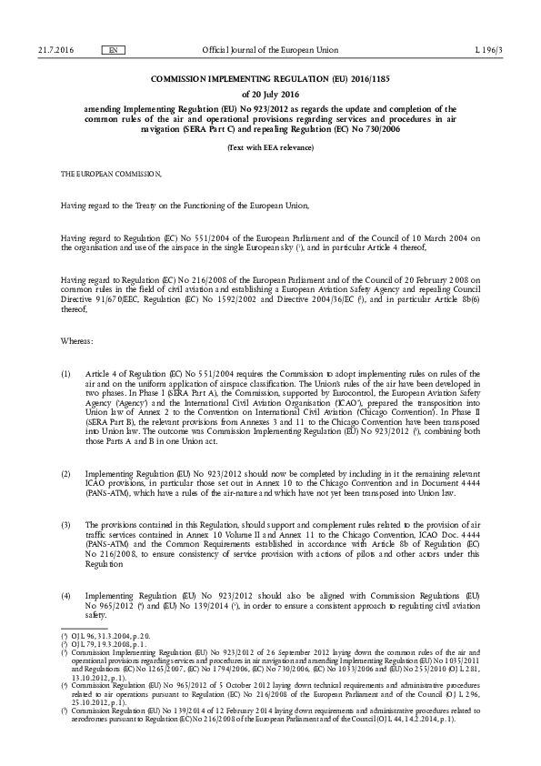 COMMISSION IMPLEMENTING REGULATION (EU) 2016/1185 of 20 July 2016 amending Implementing Regulation (EU) No 923/2012 as regards the update and completion of the common rules of the air and operational provisions regarding services and procedures in air navigation (SERA Part C) and repealing Regulation (EC) No 730/2006