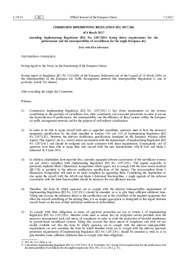 This Regulation amends Regulation 1207/2011 by giving operators additional time to comply with the equipment requirements.