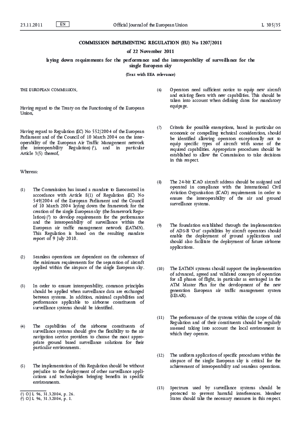 This Regulation lays down requirements on the systems contributing to the provision of surveillance data, their constituents and associated procedures in order to ensure the harmonisation of performance, the interoperability and the efficiency of these systems within the European air traffic management network (EATMN) and for the purpose of civil- military coordination.