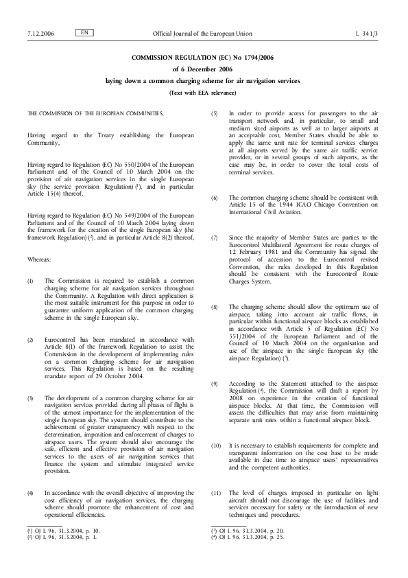 Commission Regulation (EC) No 1794/2006 laying down a common charging scheme for air navigation serv