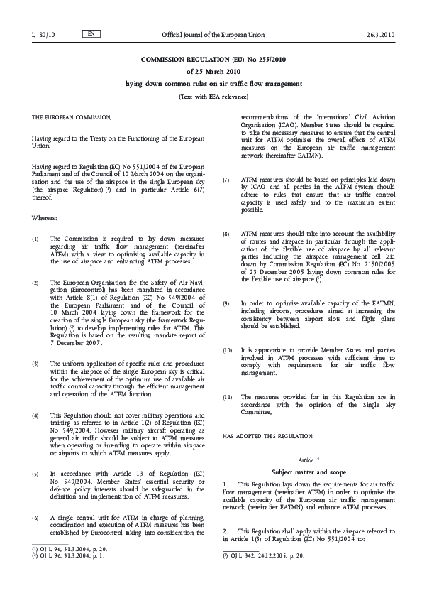 Commission Regulation (EC) No 255/2010 of 25 March 2010 laying down common rules on air traffic flow