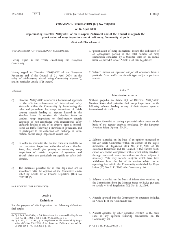COMMISSION REGULATION (EC) No 351/2008 of 16 April 2008 implementing Directive 2004/36/EC of the Eur