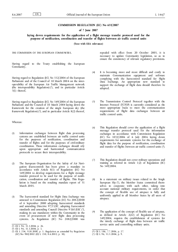 This Regulation aims to enable the automatic exchange of data between flight data processing systems of the air traffic control units for the purposes of notification, coordination and transfer of flights and for the purposes of civil-military coordination, by mandating the use of a common flight message transfer protocol.
