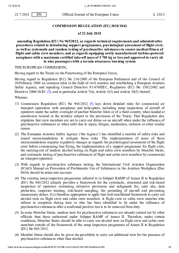 COMMISSION REGULATION (EU) 2018/1042 of 23 July 2018 amending Regulation (EU) No 965/2012, as regards technical requirements and administrative procedures related to introducing support programmes, psychological assessment of flight crew, as well as systematic and random testing of psychoactive substances to ensure medical fitness of flight and cabin crew members, and as regards equipping newly manufactured turbine-powered aeroplanes with a maximum certified take-off mass of 5 700 kg or less and approved to carry six to nine passengers with a terrain awareness warning system.