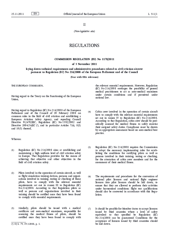 Commission Regulation (EU) No 1178/2011 of 3 November 2011 (EASA Air Crew)