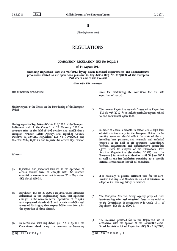 COMMISSION REGULATION (EU) No 800/2013 of 14 August 2013 amending Regulation (EU) No 965/2012 laying down technical requirements and administrative procedures related to air operations pursuant to Regulation (EC) No 216/2008 of the European Parliament and of the Council