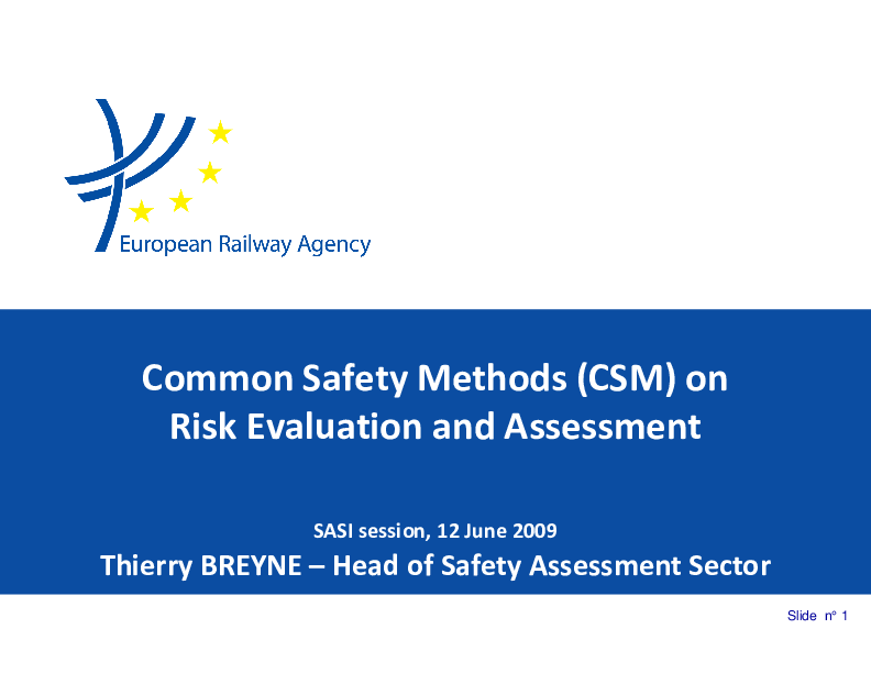 This presentation contains the common safety methods on risk evaluation and assessment in European Railway Agency: it contains the decision process, the presentation of the CSM and the presentation of the guides for the application of CSM Regulation.