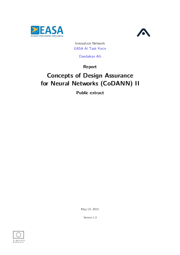 The goal of this second project was threefold: to investigate topics left out in the first project and report, to mature the concept of Learning assurance and to discuss remaining trustworthy AI building blocks from the EASA AI Roadmap. These steps pave the way to the first applications.\r\nWhere the first CoDANN project showed that using neural networks in safety-critical applications is feasible, CoDANN II addresses the remaining questions, reaching a conclusion on each of the following topics:\r\n• implementation and inference parts of the W-shaped process (hardware, software and system aspects), encompassing development and deployment aspects;\r\n• definition and role of explainability;\r\n• details on the system safety assessment process, concluding discussions on integrating neural networks into complex systems and their evaluation in safety assessments.\r\n