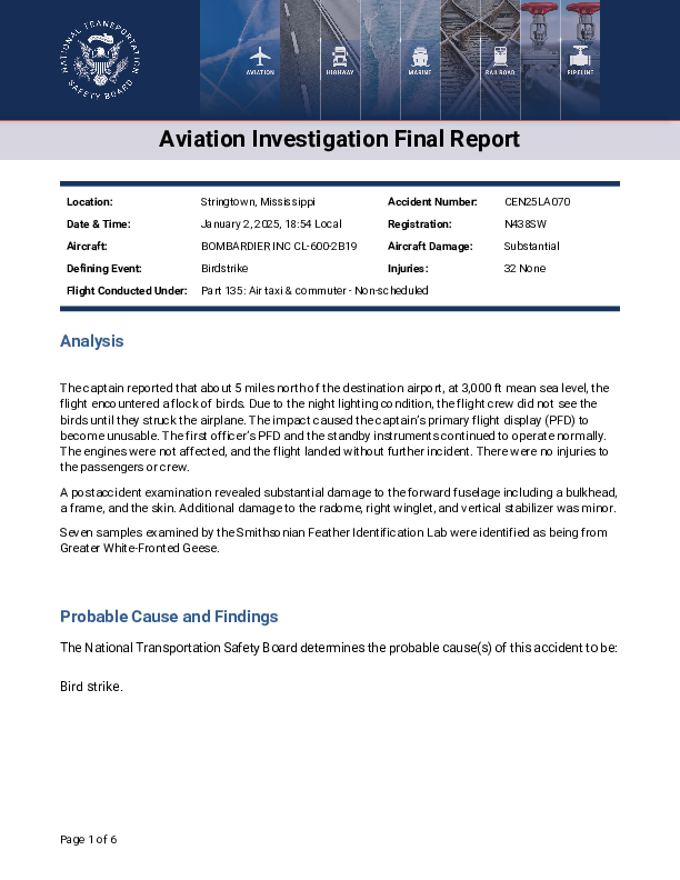 On 2 January 2025, a Mitsubishi CRJ 200LR was on final approach to Greenville at night when a flock of previously unseen large birds was struck. The engines were unaffected but significant airframe impact damage was caused with secondary consequences for normal function of some primary flight instrumentation. The approach and landing were completed without further event and the bird species involved was subsequently identified as Greater White Fronted Geese which can weigh between 2 kg and 3 kg.