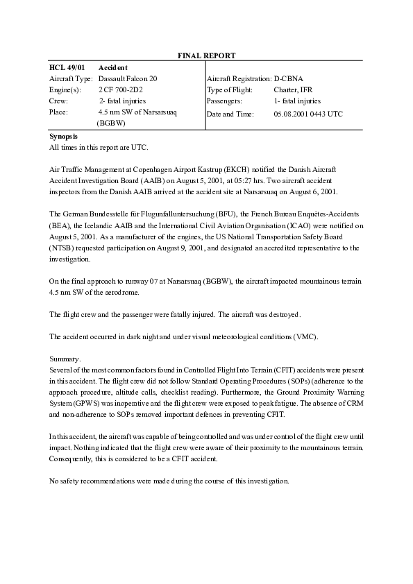 Accident report in Falcon 20 CFIT which occurred near Narsarsuaq, Greenland, 5 Aug 2001
