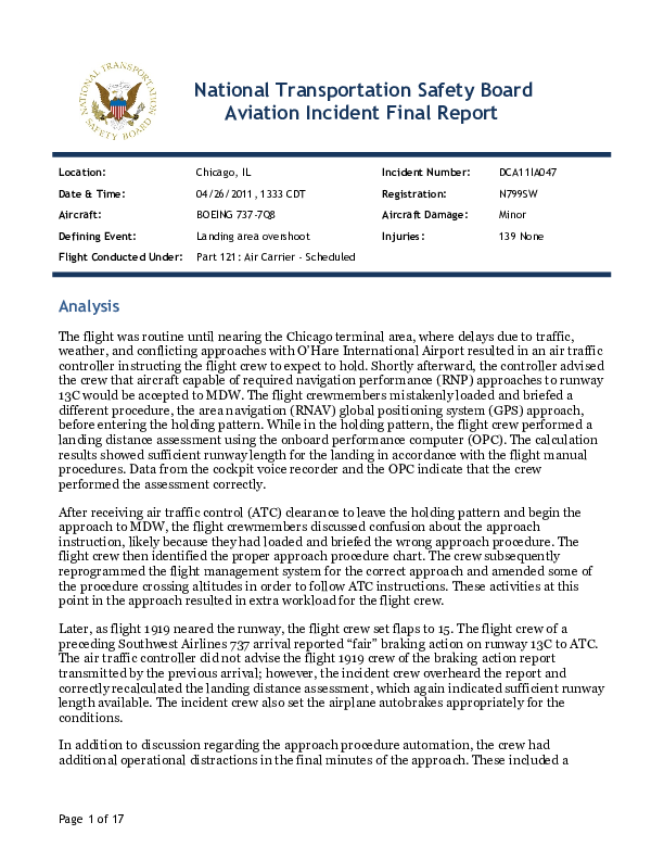 On 26 April 2011 a Boeing 737-700 being operated by Southwest AL on a scheduled passenger flight from Denver to Chicago OHare failed to stop within the paved area of runway 13C at alternate Chicago Midway in normal ground visibility and finally stopped just under 70 metres from the end of the runway in grass to the left side of the installed. The aircraft incurred only minor damage and none of the 139 occupants were injured. Passengers were eventually disembarked using steps and bussed to the Terminal.