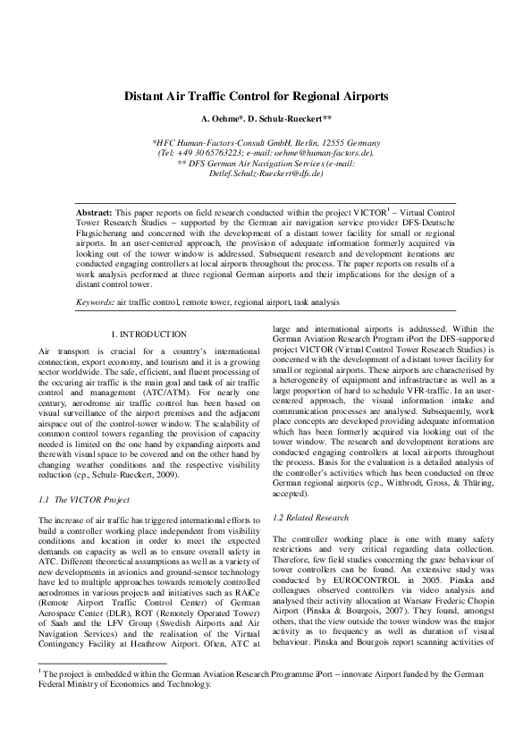 Oehme, A., & Schulz-Rueckert, D. (2010). Distant air traffic control for regional airports. Proceedings of the 11th IFAC-Symposium on Analysis, Design, and Evaluation of Human-Machine Systems. Valencienne, France. 141-145. DOI: 10.3182/20100831-4-FR-2021.00026 This paper reports on field research conducted within the project VICTOR1 � Virtual Control Tower Research Studies � supported by the German air navigation service provider DFS-Deutsche Flugsicherung and concerned with the development of a distant tower facility for small or regional airports. In an user-centered approach, the provision of adequate information formerly acquired via looking out of the tower window is addressed. Subsequent research and development iterations are conducted engaging controllers at local airports throughout the process. The paper reports on results of a work analysis performed at three regional German airports and their implications for the design of a distant control tower.