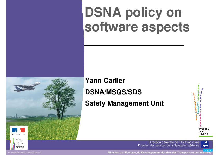 This presentation shows DSNA's perspective on software aspects, including its compliance with software regulation, DSNA SSAS and DSNA hot spots and DSNA SWAL allocation.