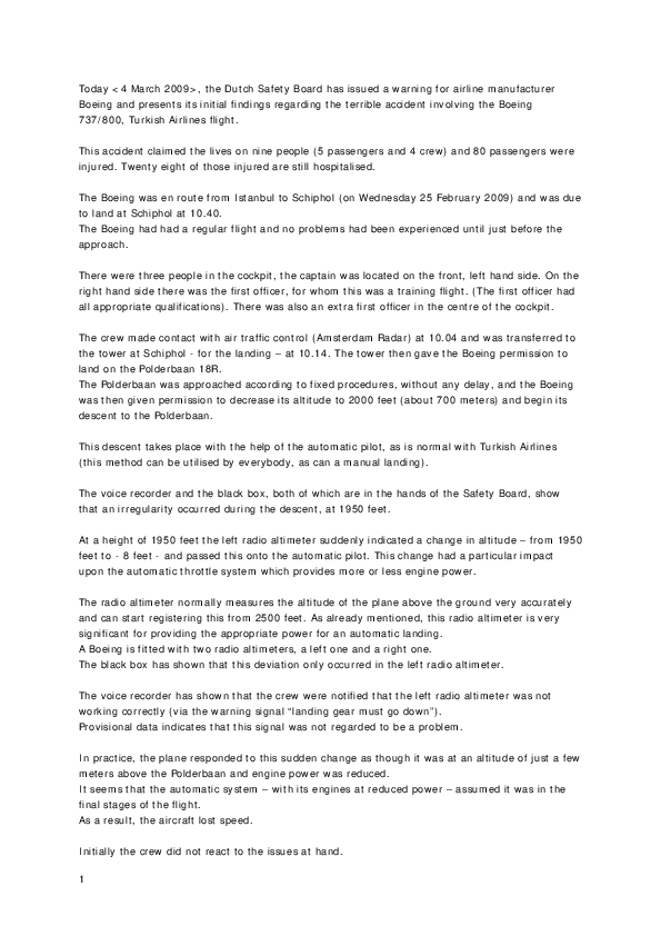 Dutch Safety Board warning dated 4 Mar 09 regarding Turkish Airlines Accident at AMS