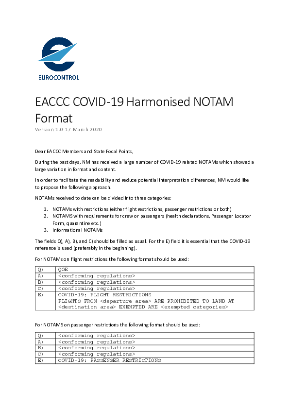 EACCC COVID-19 Harmonised NOTAM Format v1.0