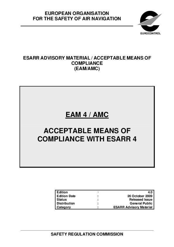 This document is intended to present the acceptable means of compliance (AMC) recognised by the SRC as possible harmonised ways to meet ESARR 4 provisions within the ECAC region. The AMCs recognised by SRC are not mandatory. They represent means, or alternative means, but not necessarily the only possible means, by which mandatory provisions established by ESARR 4 can be met under certain identified conditions. Their acceptability has successfully been demonstrated at SRC level as a result of a formal assessment.