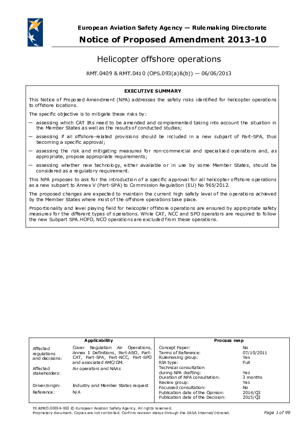 This Notice of Proposed Amendment (NPA) addresses the safety risks identified for helicopter operations to offshore locations. The specific objective is to mitigate these risks by: assessing which CAT IRs need to be amended and complemented taking into account the situation in the Member States as well as the results of conducted studies; assessing if all offshore-related provisions should be included in a new subpart of Part-SPA, thus becoming a specific approval; assessing the risk and mitigating measures for non-commercial and specialised operations and, as appropriate, propose appropriate requirements; assessing whether new technology, either available or in use by some Member States, should be considered as a regulatory requirement. This NPA proposes to ask for the introduction of a specific approval for all helicopter offshore operations as a new subpart to Annex V (Part-SPA) to Commission Regulation (EU) No 965/2012. The proposed changes are expected to maintain the current high safety level of the operations achieved by the Member States where most of the offshore operations take place. Proportionality and level playing field for helicopter offshore operations are ensured by appropriate safety measures for the different types of operations. While CAT, NCC and SPO operators are required to follow the new Subpart SPA.HOFO, NCO operations are excluded from these operations.