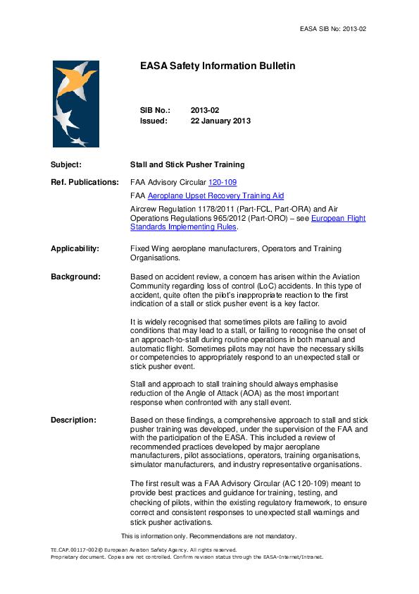 EASA Safety Information Bulletin 2013-02, 23 January 2013: Stall and Stick Pusher Training