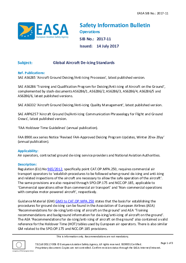 EASA Safety Information Bulletin 2017-11: Global Aircraft De-icing Standards