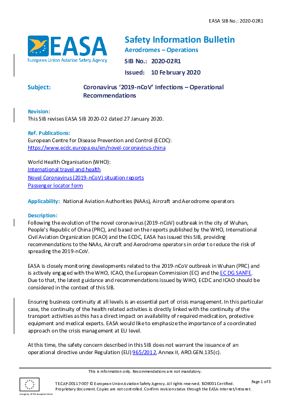 EASA SIB: Coronavirus '2019-nCoV' Infections -- Operational Recommendations
