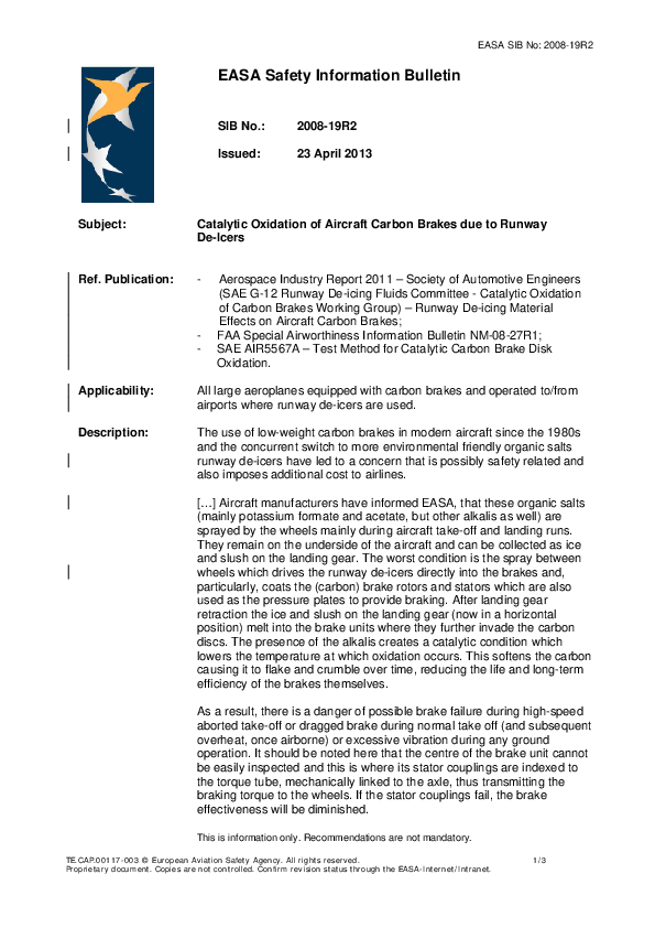 EASA SIB No: 2008-19R2 Catalytic Oxidation of Aircraft Carbon Brakes due to Runway De-Icers