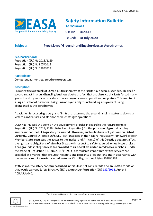 EASA SIB: Provision of Groundhandling Services at Aerodromes