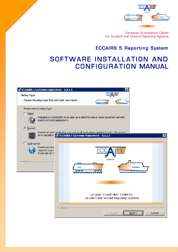The purpose of this manual is to describe a typical installation of all components of the ECF (ECCAIRS 5 Common Framework) system, as well as set-up and configuration of database components for the storage of accident/incident Occurrences in a standardised and structured manner. To simplify the reading, form now on the term ECCAIRS 5 will be used everywhere, also in place of ECF, ECCAIRS 5 Common Framework). In fact the ECCAIRS Server and all the ECCAIRS Client applications are based on the ECF layer, but this is relevant only from the software developer standpoint, and not for the User or Administrator.