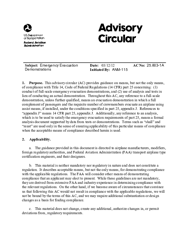 Emergency Evacuation Demonstrations, AC 25.803-1A