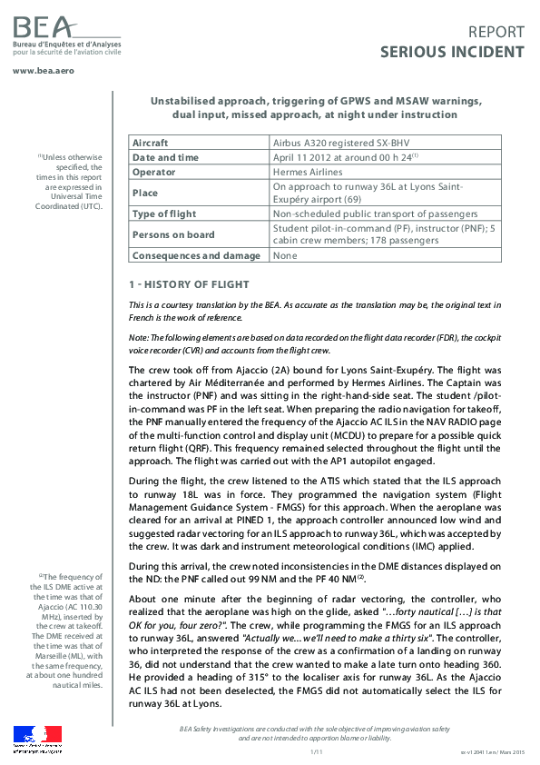 On 11 April 2012, a Hermes Airlines A320 commanded by a Training Captain who was also in charge of Air Operations for the airline was supervising a trainee Captain on a night passenger flight. The aircraft failed to establish on the Lyons ILS and, in IMC, descended sufficiently to activate both MSAW and EGPWS 'PULL UP' activations which prompted recovery. The Investigation concluded that application of both normal and emergency procedures had been inadequate and had led to highly degraded situational awareness for both pilots. The context for this was assessed to have been poor operational management at the airline.