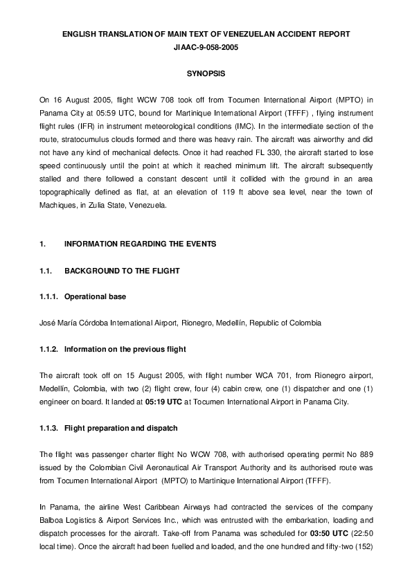 English Translation of Main Text of Venezuelan Accident Report JIAAC-9-058-2005