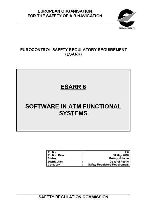 Edition 2, May 2010. ESARR 6 concerns the use of software in safety related ground-based ATM (Air Traffic Management) systems used for the provisions of ATM services to civil air traffic, including all on-line software operational changes (such