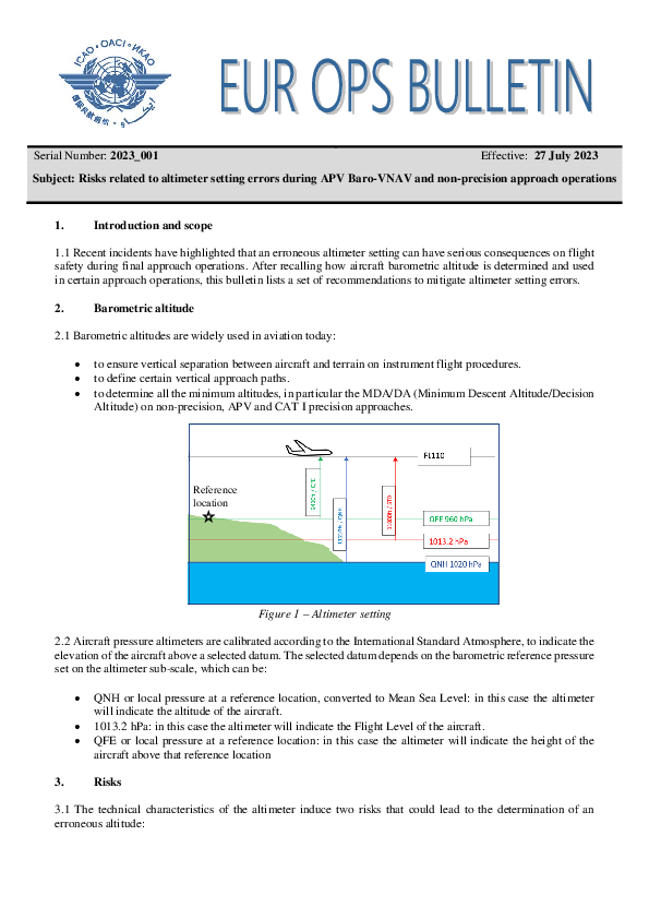 EUR OPS Bulletin 2023_001: Risks related to altimeter setting errors during APV Baro-VNAV and non-precision approach operations
