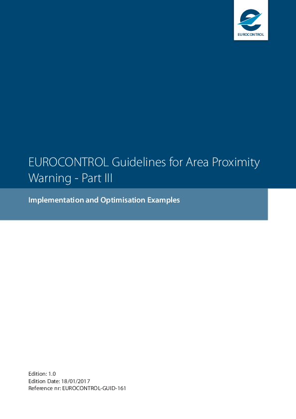 These Guidelines specify the minimum requirements and provide comprehensive guidance for the definition, implementation, optimisation and operation of Area Proximity Warning (APW). Part I describes the APW concept of operations as well as the specific requirements on APW. Part II contains overall guidance for the complete lifecycle of APW. Part III, this document, specifies a generic example of an APW implementation as well as detailed technical guidance for optimisation of APW.