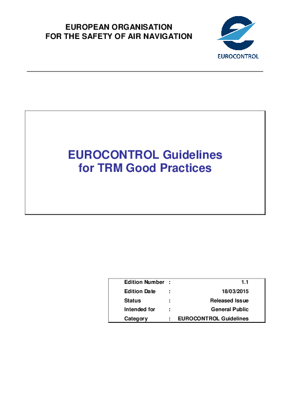 The document provides a series of guidelines based on experience gained from the implementation of TRM to assist new states to implement this HF tool and experienced states to enhance it. Team Resource Management (TRM) is defined as: Strategies available to ANSPs for the best use of all available resources - information, equipment and people - to optimise the safety and efficiency of Air Traffic Services. EUROCONTROL has been working on TRM since 1994, and now many ANSPs have some form of TRM programme for ATCOs.
