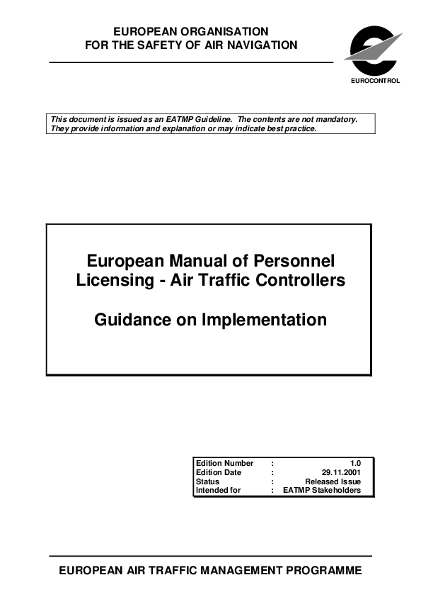 This document is intended to assist those Air Traffic Control (ATC) Service Provision or Regulatory Administrations who have decided to implement the provisions of the 'European Manual of Personnel Licensing - Air Traffic Controllers' (EATMP, 2000a) in order to fulfil the requirements of the EUROCONTROL Safety Regulatory Requirement - ATM Services' Personnel (ESARR5) with regard to air traffic controllers (SRC, 2000).