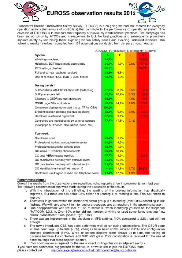Eurocontrol Routine Observation Safety Survey (EUROSS) is a on-going method that records the everyday operation actions (behaviours of controllers) that contribute to the performance of operational system. The objective of EUROSS is to measure the frequency of previously identified best practices. The campaign has been set up jointly by ATCOs and management to look for best practices and subsequently proactively improve safety by reinforcing them, exposing hidden safety issues and avoiding undesired incidents. The following results have been compiled from 154 observations conducted from January through August.