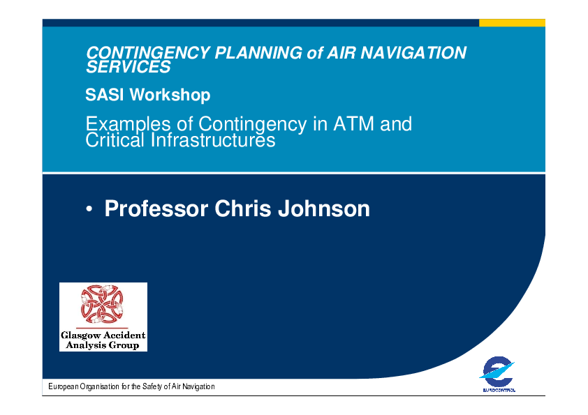 This is a presentation by Prof. Chris Johnson about examples of contingency in ATM and critical infrastructures. In this presentation, fires, earthquakes, rainfalls, power failures, pandemics or even war and counter terrorism are only a few examples of possible contingencies.