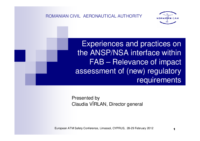 This presentation describes the national environment, the global and regional rulemaking processes, DANUBE FAB environment, focusing on the relevance of the impact assessment of regulatory requirements at Romanian CAA.