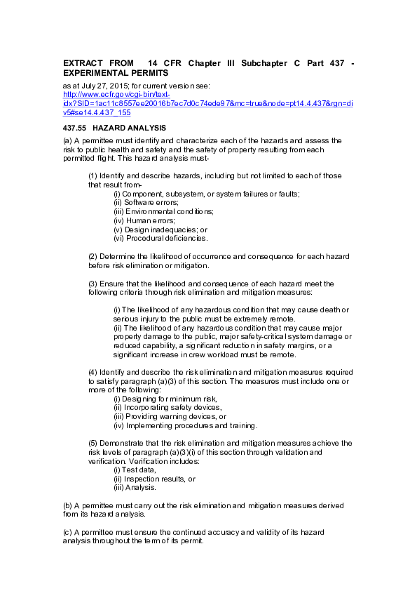 EXTRACT FROM 14 CFR Chapter III Subchapter C Part 437 - EXPERIMENTAL PERMITS