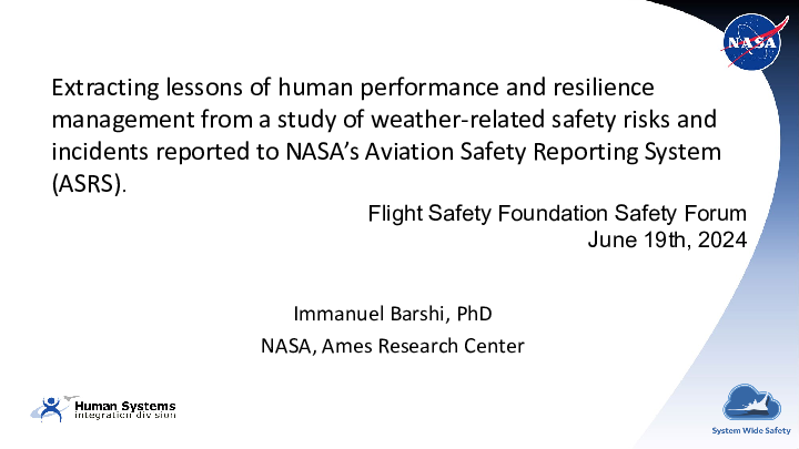 Extracting Lessons of Human Performance and Resilience Management From a Study ofWeather-Related Safety Risks and Incidents reported to NASA’s Aviation Safety ReportingSystem (ASRS) | Immanuel Barshi, NASA