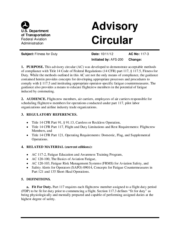 This advisory circular (AC) was developed to demonstrate acceptable methods of compliance with Title 14 Code of Federal Regulations (14 CFR) part 117, § 117.5, Fitness for Duty.