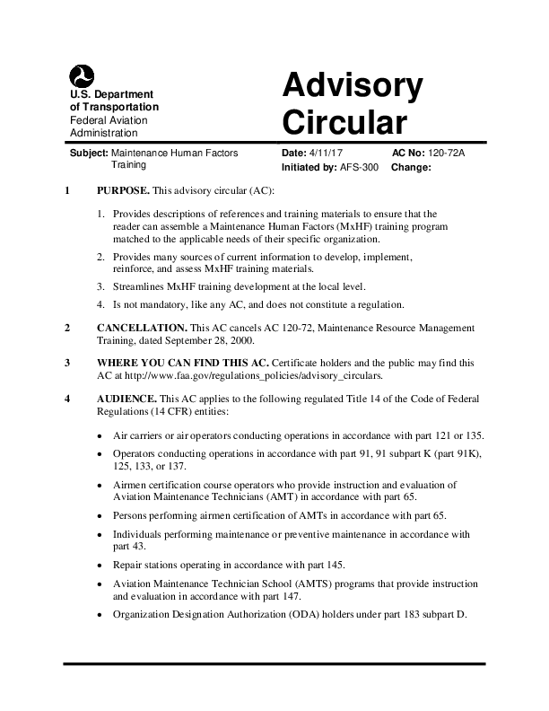 FAA AC 120-72A: Maintenance Human Factors Training