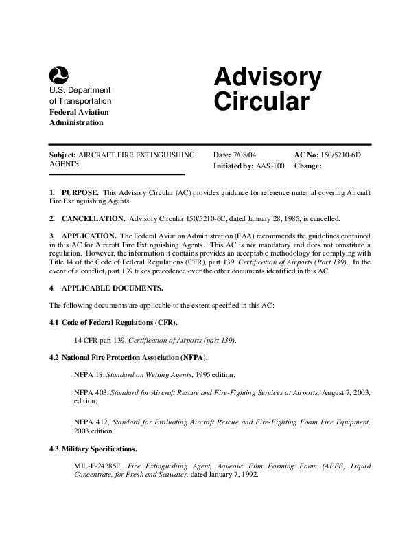 This Advisory Circular (AC) provides guidance for reference material covering Aircraft Fire Extinguishing Agents. The Federal Aviation Administration (FAA) recommends the guidelines contained in this AC for Aircraft Fire Extinguishing Agents. This AC is not mandatory and does not constitute a regulation. However, the information it contains provides an acceptable methodology for complying with Title 14 of the Code of Federal Regulations (CFR), part 139, Certification of Airports (Part 139). In the event of a conflict, part 139 takes precedence over the other documents identified in this AC.