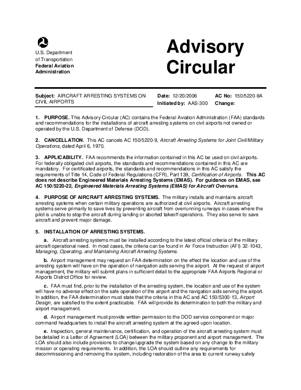 This Advisory Circular (AC) contains the Federal Aviation Administration (FAA) standards and recommendations for the installations of aircraft arresting systems on civil airports not owned or operated by the U.S. Department of Defense (DOD).