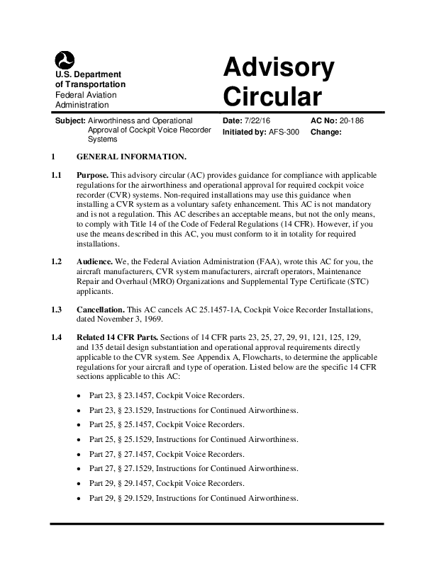 FAA AC 20-186 'Airworthiness and Operational Approval of Cockpit Voice Recorder Systems'