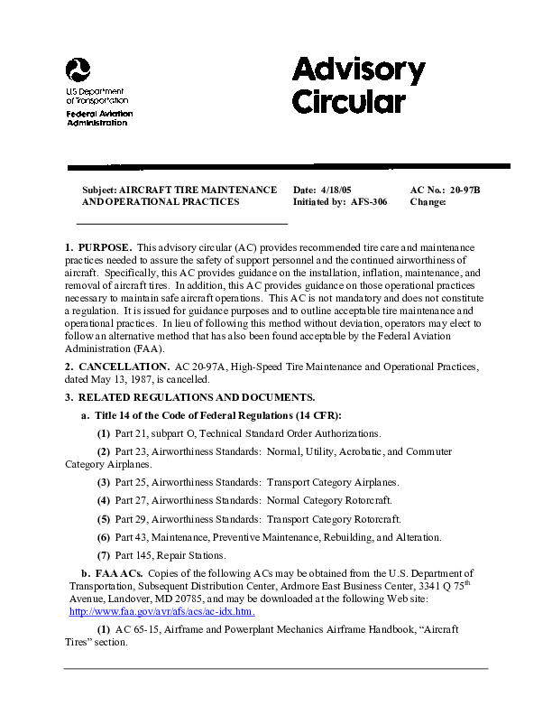 FAA AC 20-97B: Aircraft Tire Maintenance and Operational Practices
