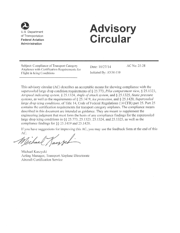 FAA AC 25-28: Compliance of Transport Category Airplanes with Certification Requirements for Flight in Icing Conditions