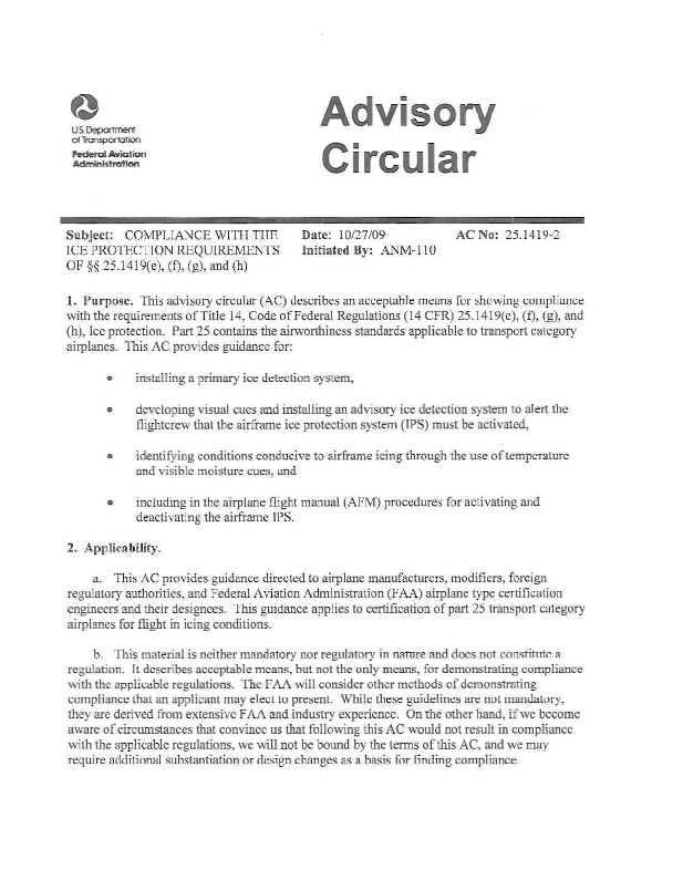 FAA AC 25.1419.2 Ice Protection Requirements of 25.1419 (e), (f), (g), and (h), 27 October 2009