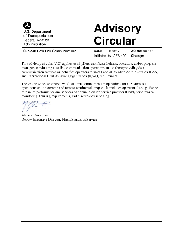 The AC provides an overview of data link communication operations for U.S. domestic operations and in oceanic and remote continental airspace. It includes operational use guidance, minimum performance and services of communication service provider (CSP), performance monitoring, training requirements, and discrepancy reporting.