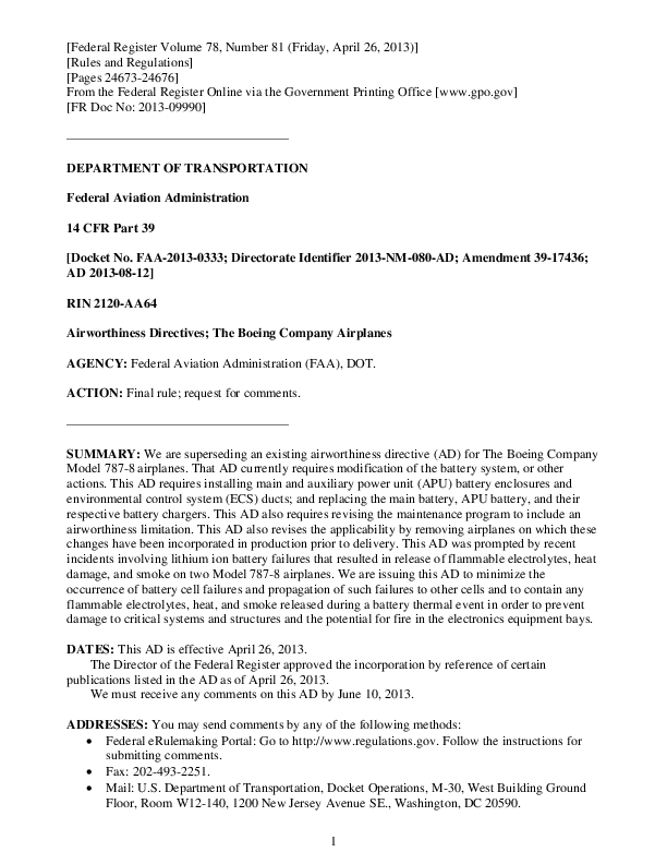Airworthiness directive relating to Boeing 787-800 aircraft batteries. Published April 2013.